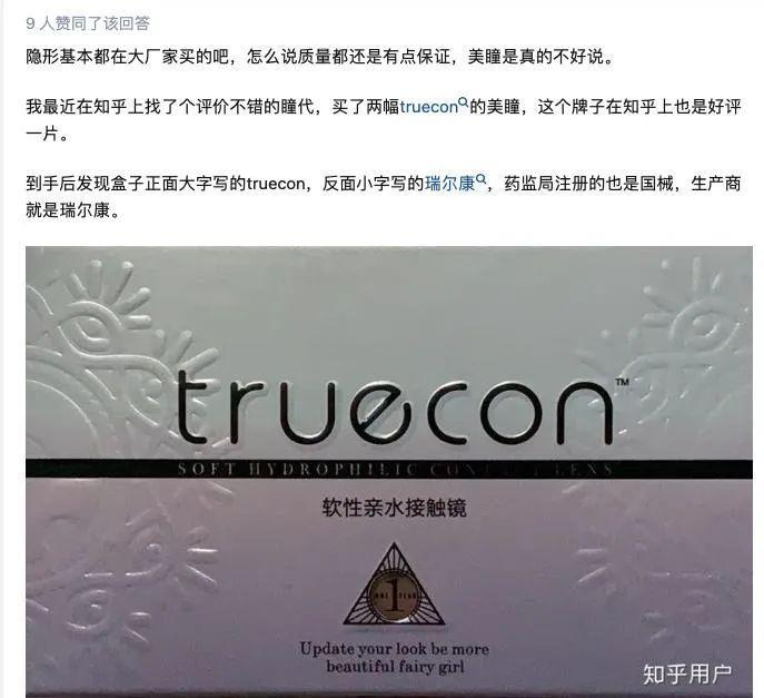 实际上,披着“洋品牌”外衣的国货并非只有艾乐视。在知乎APP上,声称日本进口的美瞳品牌truecon,也被很多网友发现包装后面用小字标注“瑞尔康”;而另一款网红品牌bollycon,也被爆出国产版和韩国版同款同售,但悄悄将“韩国医用硅水”换成国内生产的非离子材质,生产企业也变成了吉林瑞尔康隐形眼镜有限公司。