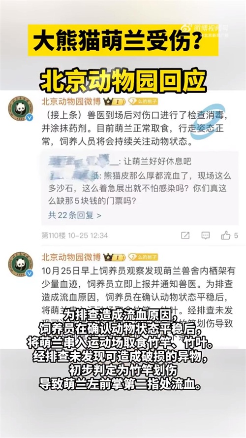 北京动物园微博回应称:10月25日早上饲养员观察发现萌兰兽舍内栖架有少量血迹,饲养员立即上报并通知兽医。为排查造成流血原因,饲养员在确认动物状态平稳后,将萌兰串入运动场取食竹竿、竹叶。经排查未发现可造成破损的异物,初步判定为竹竿划伤导致萌兰左前掌第二指处流血。兽医到场后对伤口进行了检查消毒,并涂抹药剂。目前萌兰正常取食,行走姿态正常,饲养人员将会持续关注动物状态。
