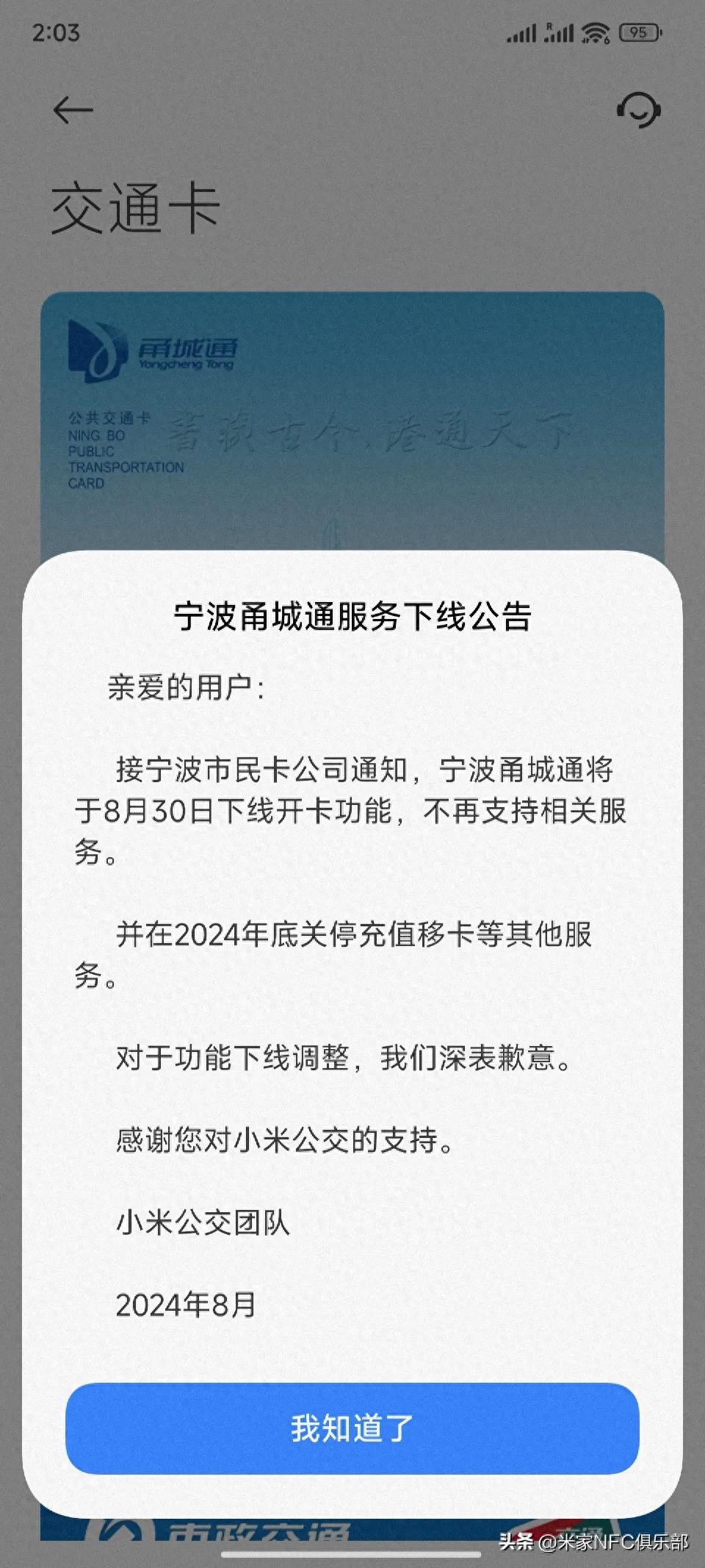 接宁波市民卡公司通知,宁波甬城通将于8月30日下线开卡功能,不再支持相关服务。并在2024年底关停充值移卡等其他服务。对于功能下线调整,我们深表歉意。感谢您对小米公交的支持。