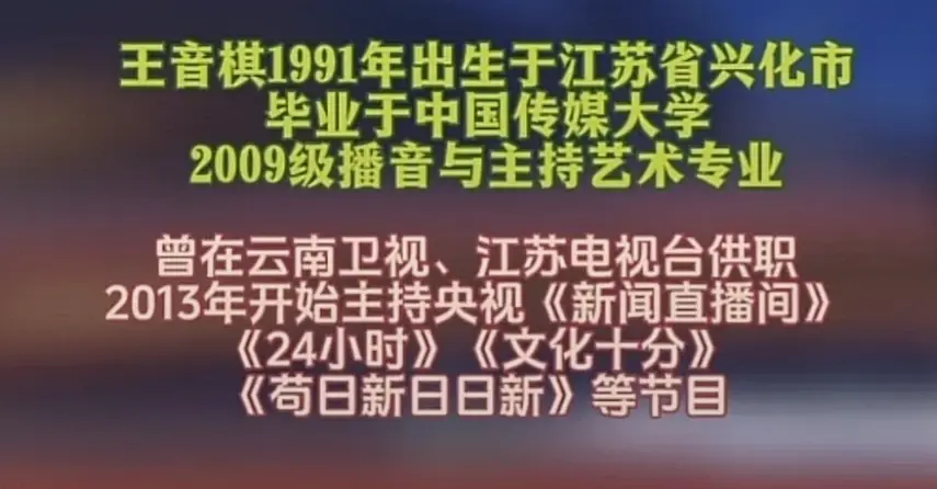 王音棋,1991年5月1日出生于江苏省兴化市,毕业于“播音界的黄埔军校”中国传媒大学。主修播音与主持艺术专业。从小成绩优异,一直是学校的文艺骨干。大大小小的新闻节目她也有始有终,每一项任务都完成的万无一失。
