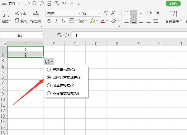 2.点击“自动填充选项”,选择“以序列方式填充”;