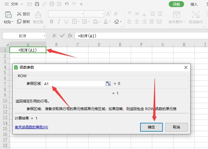 1.打开excel文档,在单元格输入“=ROW(A1)”,点击确定;