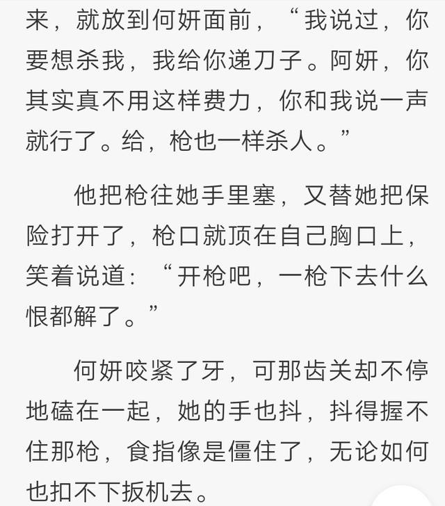 第二个地方是傅慎行找来梁远泽放何妍他们离开,对何妍说,阿妍,别回头,一直往前走,永远别回头,随后一声枪响,何妍知道是傅慎行自杀了,这时候她是开心的吗?我觉得并不是,她泪流满面,浑身颤抖,她内心深处并没有希望他死。