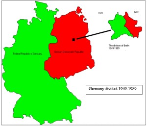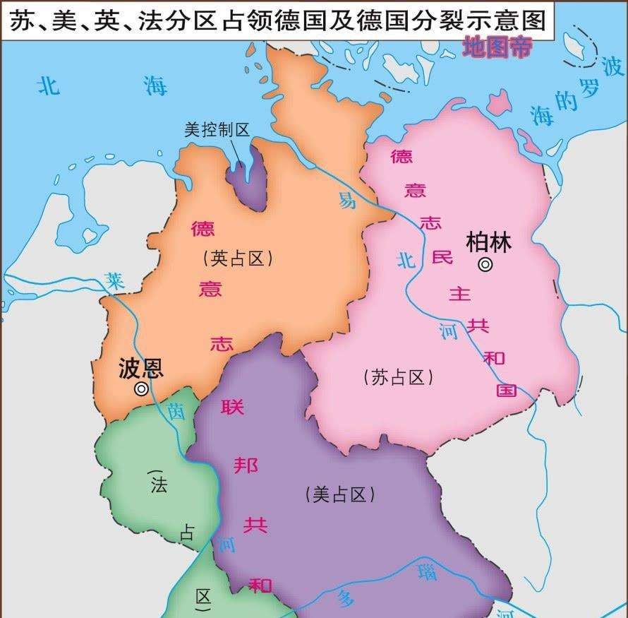 德国战败后,被美苏英法四国分区占领。之后美英法三国占领的地方合并在一起,苏联占领的地方由另一个政权统治。在美苏两国共同的支持下,德国分成了两个国家。一个是苏联占领的德国东部地区,成立一个国家叫德意志民主共和国,简称东德。还有一个是美国占领的德国西部地区,成立叫德意志联邦共和国的国家,也叫西德。这就是东德和西德的由来。