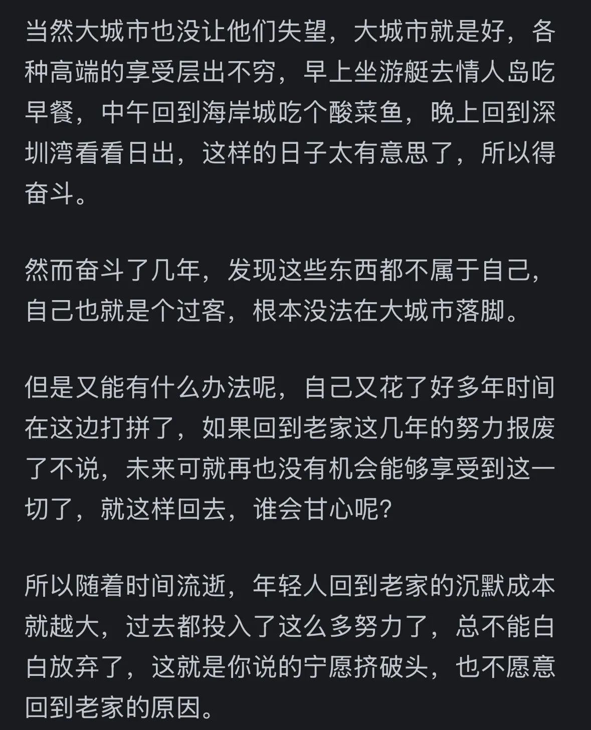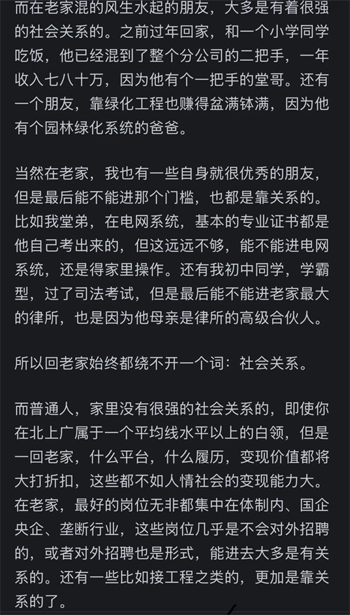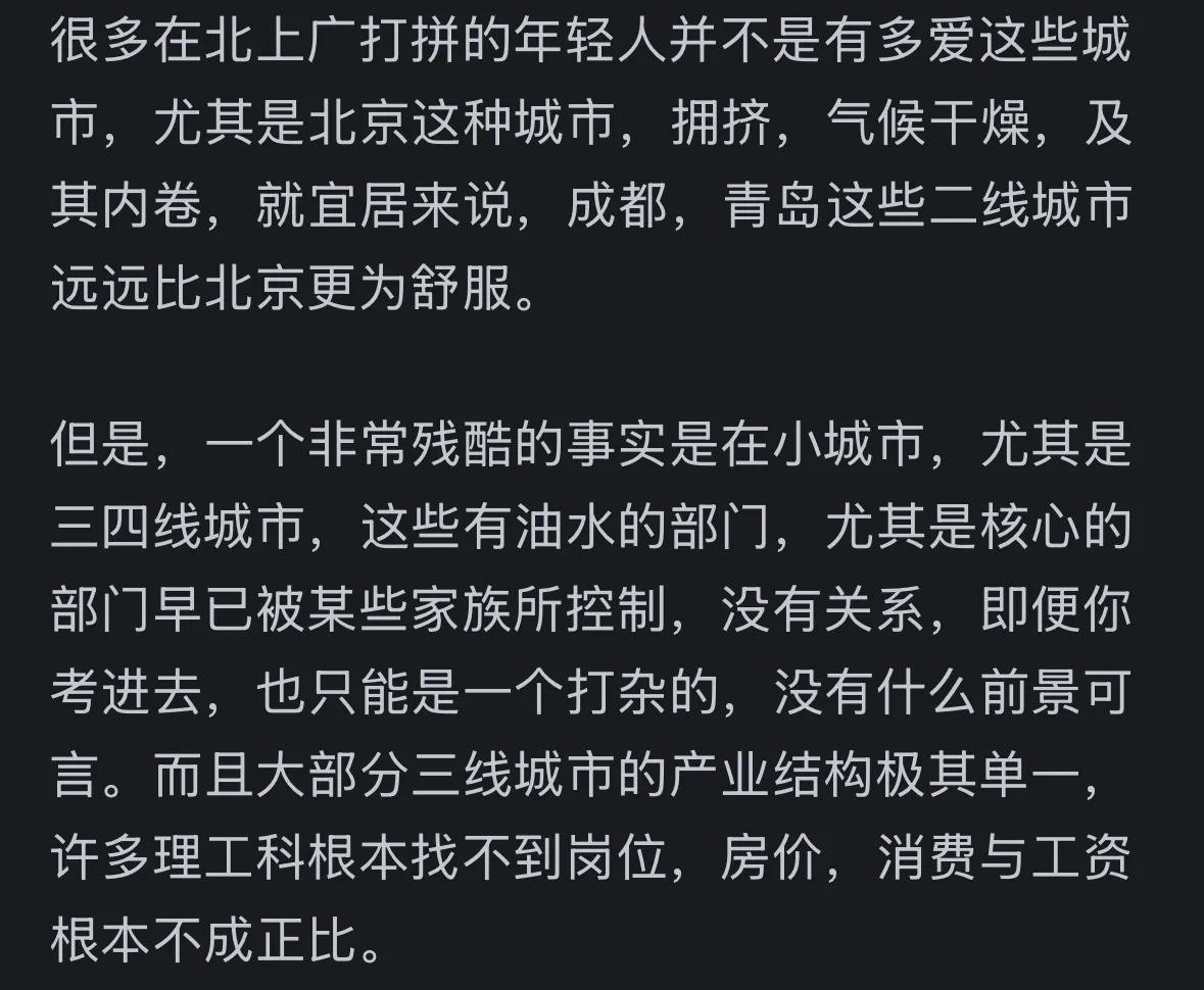 其实事实真的是这样。如果回老家工作有安排,家里还有钱,谁会去大城市卷?