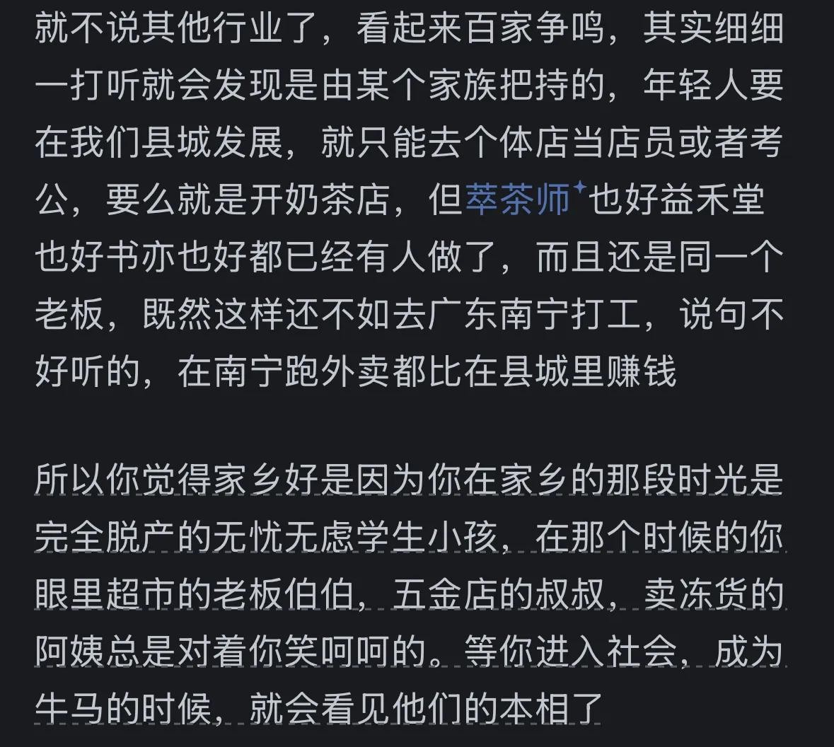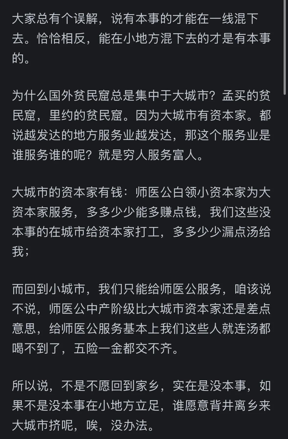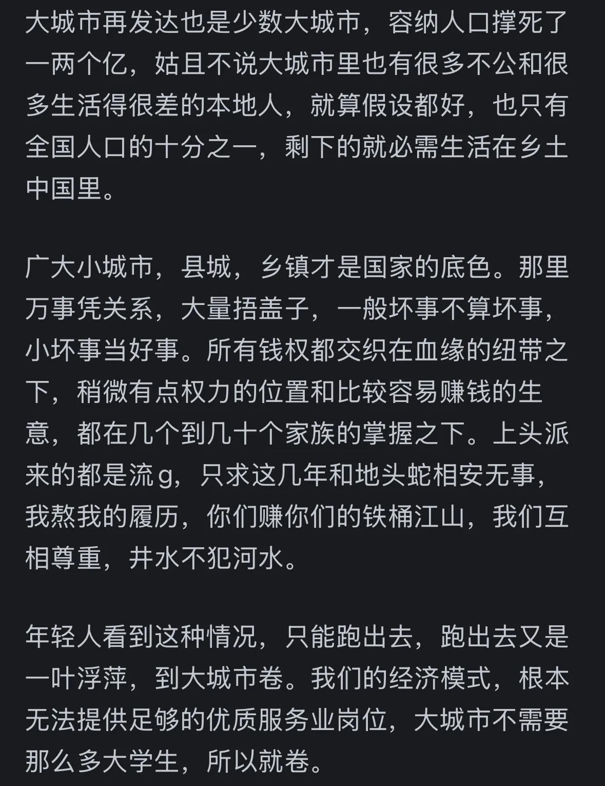 中国农村和县城才是真实的中国,才是“乡土中国”,才有资代表整个国家的真实情况。大城市对于穷人来说只是个过渡。
