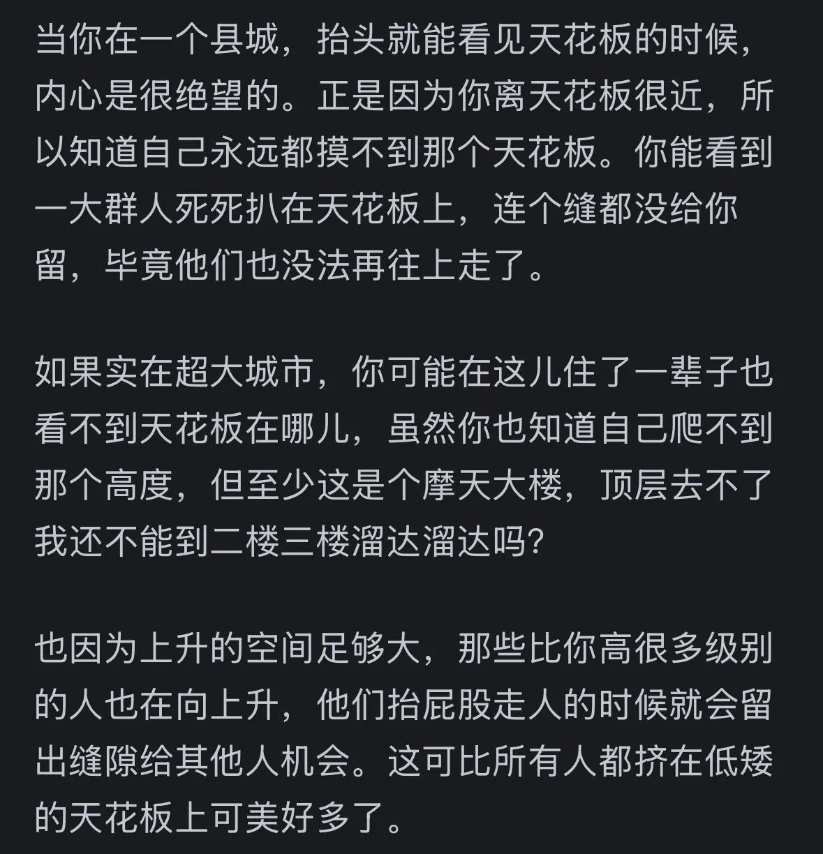 “正是因为你离天花板很近”和“顶层去不了我还不能到二楼三楼溜达溜达吗”:小城市的“离天花板很近”到底比大城市的“二三楼”高还是低?我觉得这是最关键的。我认为核心不是希望而是“我个人的绝对高度”。那里高去哪。