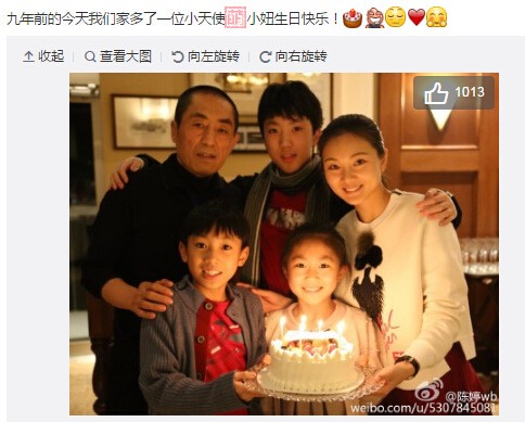 早前,张艺谋妻子陈婷通过微博晒出一家五口的合影,并留言称:“九年前的今天我们家多了一位小天使,小妞生日快乐!”