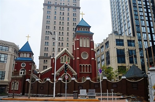 青岛天主教堂 ,哥德式和罗马式建筑风格,是青岛最大的罗马建筑,也是中国唯一的祝圣教堂。