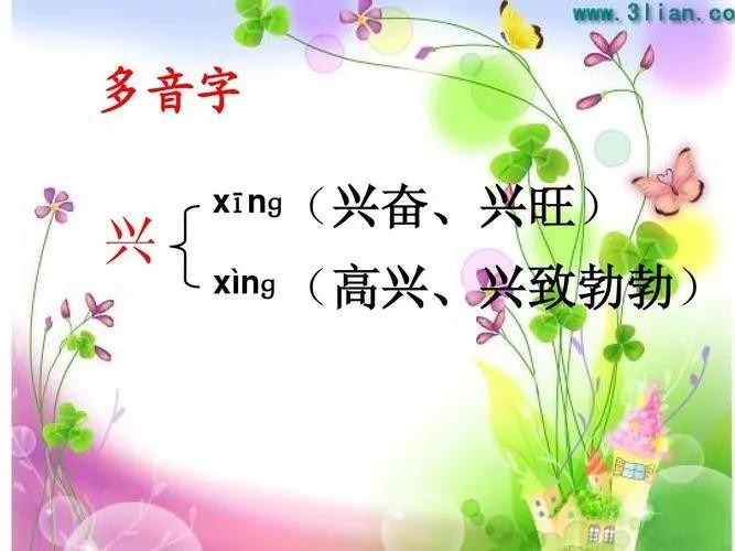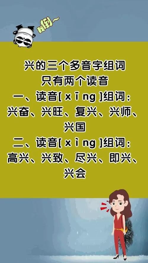 在搞清楚了“兴”这个多音字的具体意义之后,对它怎么读就心中有数了:当它作动词、副词、名词(姓)的时候,就一定要读作“xīng”。我们这里所说的“振兴”中的“兴”,就是这种读法;而当它作名词(姓除外)和别的字组成一个新词作形容词时,一定要读作“xìng”。