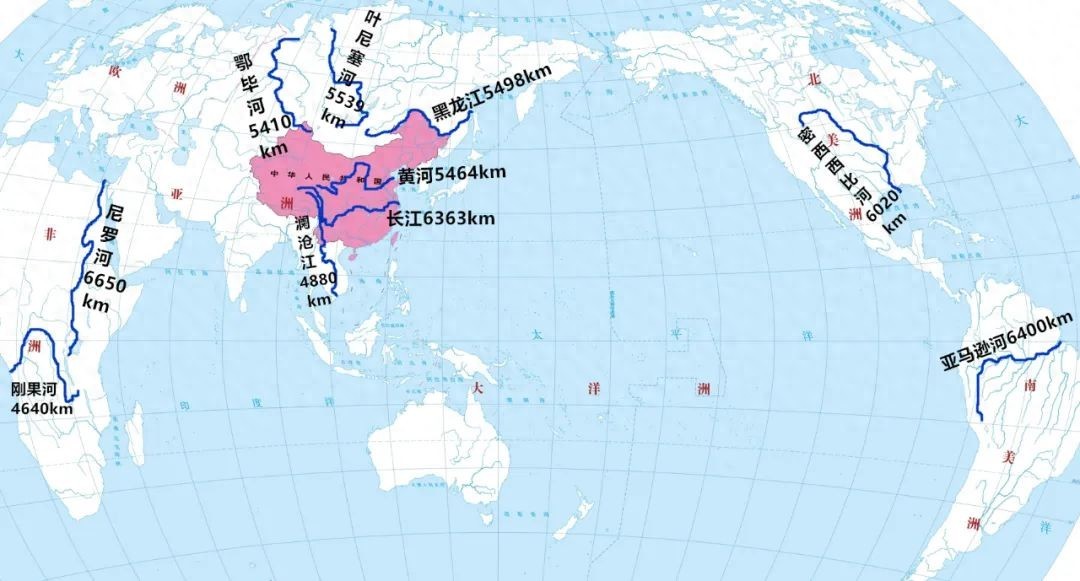 上面是世界十大长河分布图,是按照河源唯远原则,得到的数据和排名。其中澜沧江和刚果河没到5000公里。黑龙江以克鲁伦河为源,叶尼塞河穿透贝加尔湖溯源色楞格河,鄂毕河按照额尔齐斯河为源,密西西比河按照密苏里河为源。