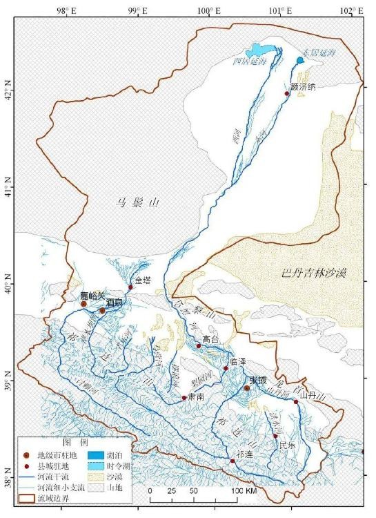 黑河古代也叫“黑水”或“弱水”,现在也还在用这两个别名,发源于青海省祁连山北麓中段,以冰雪融水补给,向北穿过河西走廊,最后注入居延海。这两条一大一小的河流,名字强相关。
