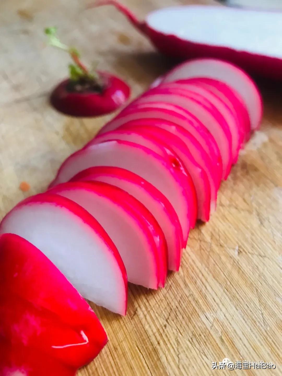 2、水萝卜切厚片,能吸收更多汤汁,吃起来更有口感。