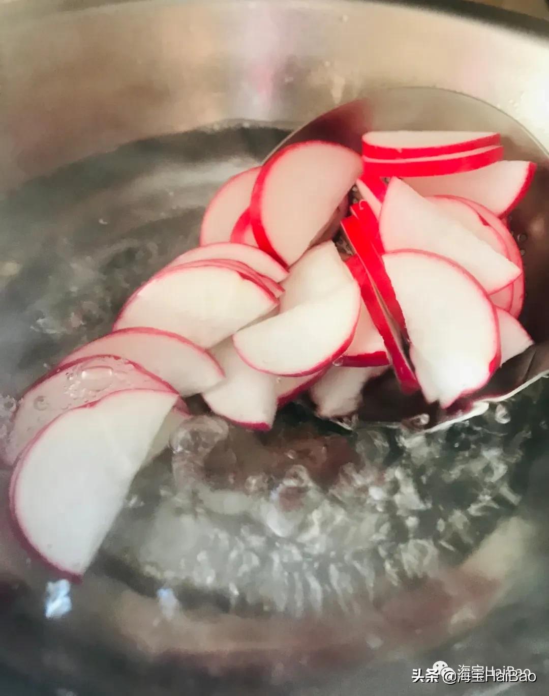 3、水萝卜焯水,因为水萝卜水汽重,焯水后能更好地吸收鱼味。