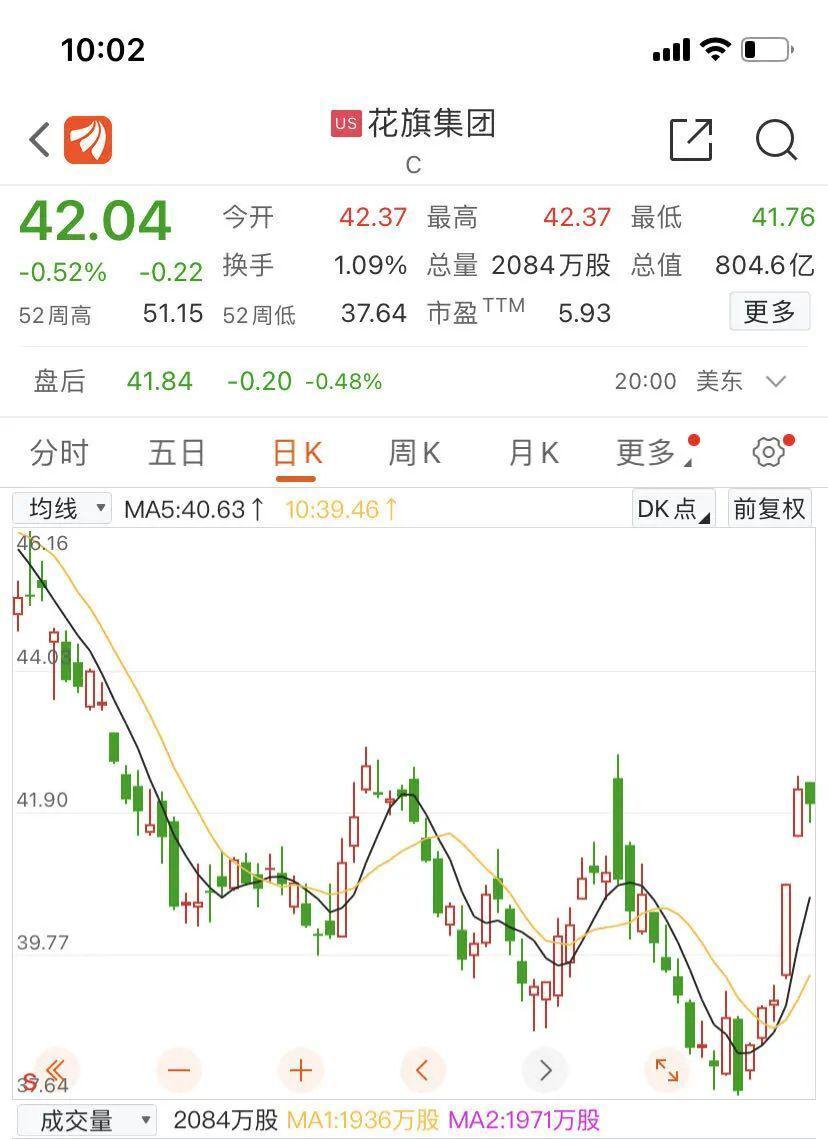 截至美股收盘,花旗集团(C)跌 0.52%,暂报 42.04 美元,最新市值 804.6 亿美元(约合人民币 5853 亿元)。