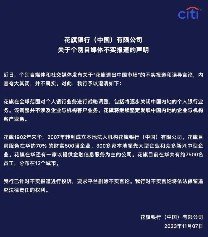 11 月 7 日,花旗银行(中国)有限公司发布声明称,近日,个别自媒体和社交媒体发布关于 " 花旗退出中国市场 " 的不实报道和误导言论,内容夸大其词,并不属实。花旗在声明中称:" 花旗在全球范围对个人银行业务进行战略调整,包括将逐步关闭中国内地的个人银行业务。该调整并不涉及企业与机构客户业务,花旗将继续坚定发展中国内地的企业与机构客户业务。我行已针对不实报道进行投诉,要求平台删除不实言论。我行已针对不实报道进行投诉,要求平台删除不实言论。我行对不实言论将依法保留追究法律责任的权利。"
