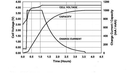 大于1C的恒流充电并不会缩短整个充电周期时间,因此这种做法不可取。当以更高电流充电时,由于电极反应的过压以及电池内部阻抗上的电压上升,电池电压会更快速地上升。恒流充电阶段会变短,但由于下面恒压充电阶段的时间会相应增加,因此总的充电周期时间并不会缩短。