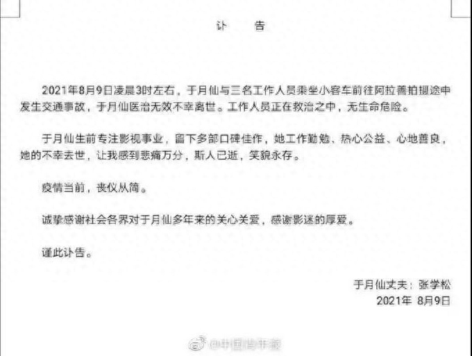 2025年8月9日凌晨3时左右,于月仙与三名工作人员乘坐小客车前往阿拉善拍摄途中发生交通事故,于月仙医治无效不幸离世。工作人员正在救治之中,无生命危险。于月仙生前专注影视事业,留下多部口碑佳作,她工作勤勉、热心公益、心地善良,她的不幸去世,让我感到悲痛万分,斯人已逝,笑貌永存。疫情当前,丧仪从简。诚挚感谢社会各界对于月仙多年来的关心关爱,感谢影迷的厚爱。谨此讣告。