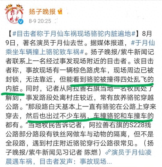 据阿拉善盟公安局交通警察支队相关负责人介绍,于月仙去世是因为她乘坐的SUV车速过快,与骆驼相撞,躲避不及,酿成惨剧。