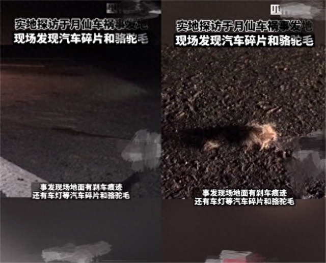 媒体记者也实地探查了当时的车祸现场,据悉虽然现场周边被封锁,但是能看到骆驼被撞得四处乱飞的内脏。目前于月仙发生车祸的车辆已经不在现场,撞死的骆驼也已经被拉走,但是现场仍能看到清晰的刹车痕迹,以及散落在地上,随处可见的汽车碎片和骆驼毛。