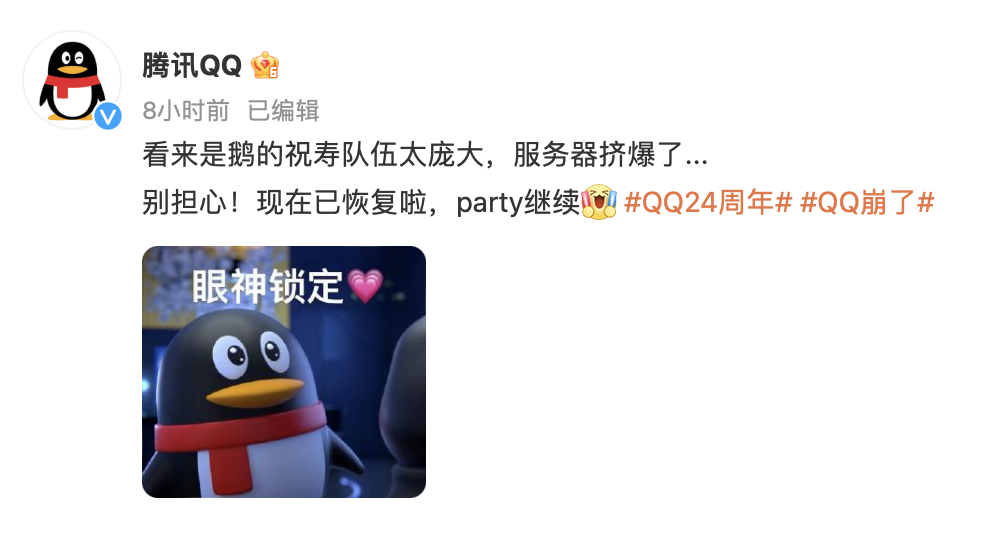 但可惜的是,即使腾讯QQ在全平台努力营业,QQ 24周年这个话题依旧没能引起大家的关注,直到QQ在“生日”当天服务器罢工,大量用户无法正常使用,QQ才真正引起了大家的注意。没错,在24岁生日的现场,腾讯QQ居然还需要“咬打火机”才能引起关注。