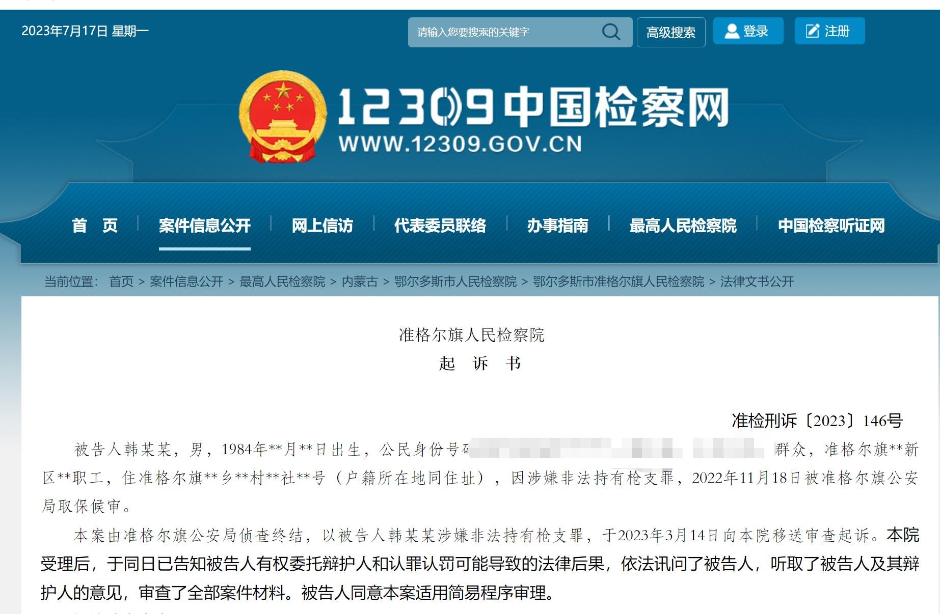 近日,中国检察网公布了一则起诉书。内蒙古准格尔旗一男子韩某某通过线上、线下途径购买了材料,将其自行改造成枪支和子弹后存放于自己家中。因涉嫌非法持有枪支罪,韩某某于2022年11月18日被准格尔旗公安局取保候审。因其如实供述自己的犯罪事实,自愿认罚认罪,检察院认为可以从宽处理,并依法对其提起公诉。