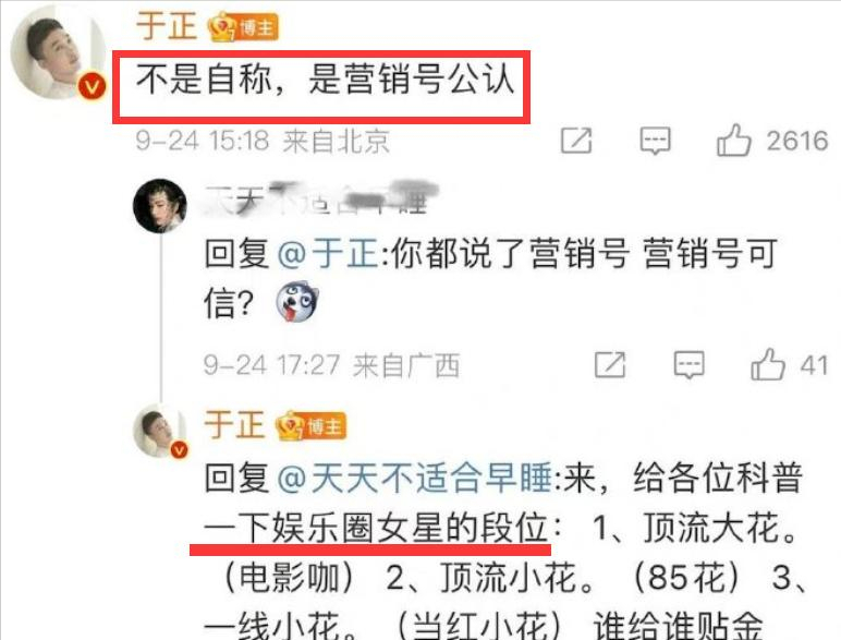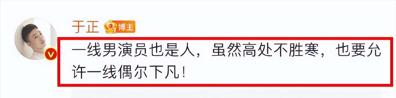 于正回应:“一线男演员也是人,虽然高处不胜寒,也要允许一线偶尔下凡”,简单3段话里提到了两次“一线”,还不忘押韵,可见于正对一线的看中。