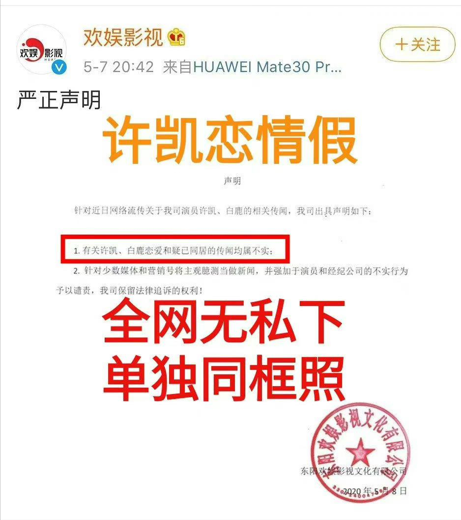 声明中表示网传的许凯和白鹿恋爱和疑已同居均未不实消息,两人全网甚至没有私下单独的同框照。