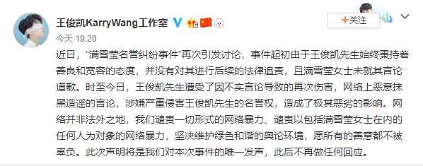 近日,“满雪莹名誉纠纷事件”再次引发讨论,事件起初由于王俊凯先生始终秉持着善良和宽容的态度,并没有对其进行后续的法律追责,且满雪莹女士未就其言论道歉。时至今日,王俊凯先生遭受了因不实言论导致的再次伤害,网络上恶意抹黑造谣的言论,涉嫌严重侵害王俊凯先生的名誉权,造成了极其恶劣的影响。网络并非法外之地,我们谴责一切形式的网络暴力、谴责以包括满雪莹女士在内的任何人为对象的网络暴力,坚决维护绿色和谐的舆论环境,愿所有的善意都不被辜负。此次声明将是我们对本次事件的唯一发声,此后不再做任何回应。