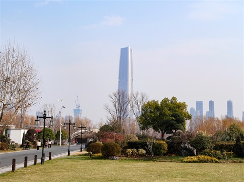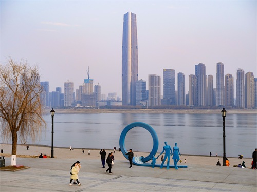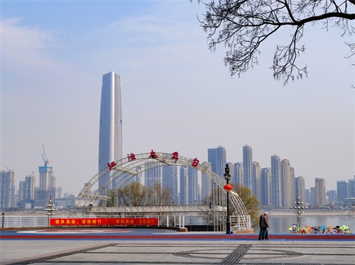 绿地中心封顶后,被江城市民送了个“平头哥”的外号,实属精准。春日融融,江滩游人如织,镜头捕捉到一只风筝,它无巧不巧送了平头哥一顶三色彩帽。