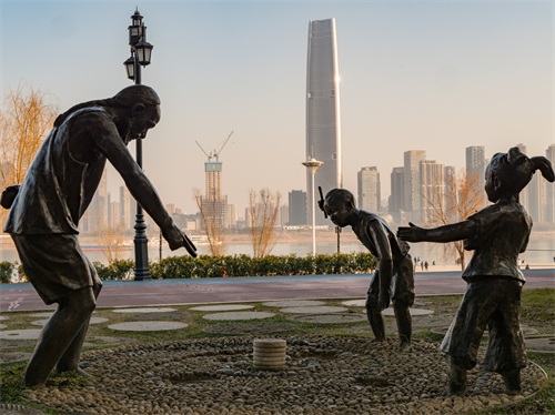 江滩有一组玩陀螺的雕塑,看人物服饰是满清时期的,汉口开埠于1861年,发展到二十世纪初,成为全国仅次于上海的国际大都市,被誉为“东方芝加哥”。