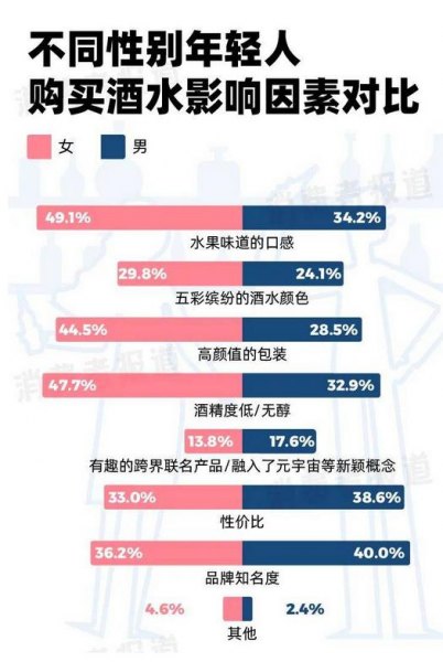 结合性别来看,男性选择的头三类是白酒、啤酒、葡萄酒;但女性是葡萄酒(47.2%)、果酒(45.4%)和啤酒(34.4%)。对于女性而言,白酒的喜好占比仅占13.8%,甚至低于威士忌(14.7%)。站在这个角度上来看,以果酒等形式出圈的低度数酒,其实和红酒一样,更容易受到年轻女性消费者认可。
