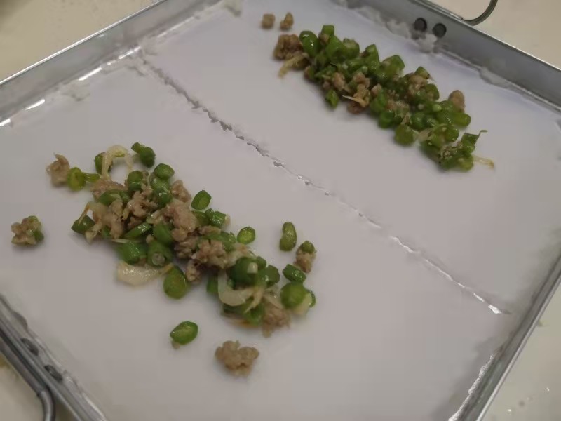 第四步:把起锅的簸箕粉皮平均划成几份,包裹馅料成条状。
