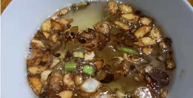 第五步:煎葱油,少量蒜和葱白部分,切细。 锅里热油,放入蒜和葱白,煎香即可(不要煎太久,容易烧焦或者发苦)