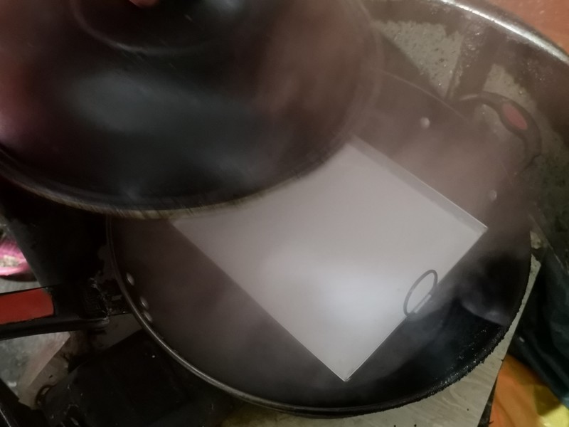 第三步:把米浆薄薄均匀铺开洋铁盘子表面后置于木盖大锅猛火蒸制约30秒成粉皮状。一定要盖上锅盖,粄皮鼓起来说明就是好了。