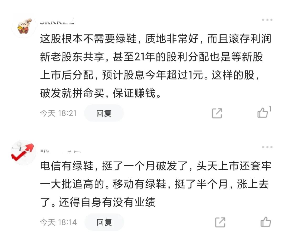 电信有绿鞋,挺了一个月破发了,头天上市还套牢一大批追高的。移动有绿鞋,挺了半个月,涨上去了。还得自身有没有业绩。
