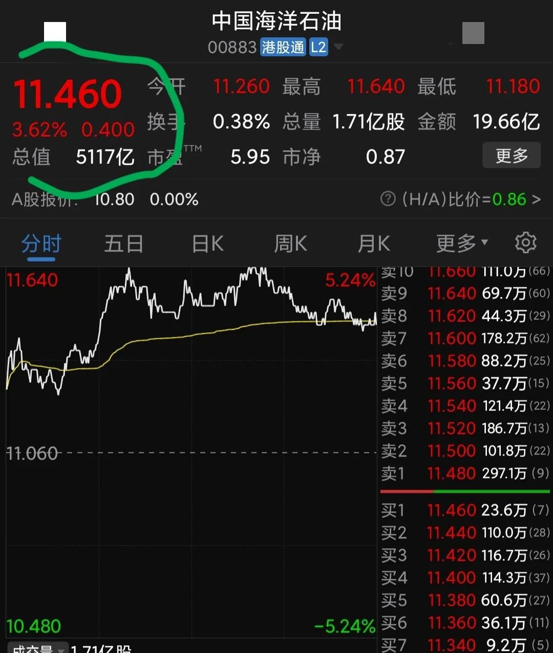 截止4月13日收盘,港股中国海油股价涨了3.62个点,收于11.46港元,折合人民币仅仅9.3元!如果不申购,直接买港股还比10.8元便宜1.5元!