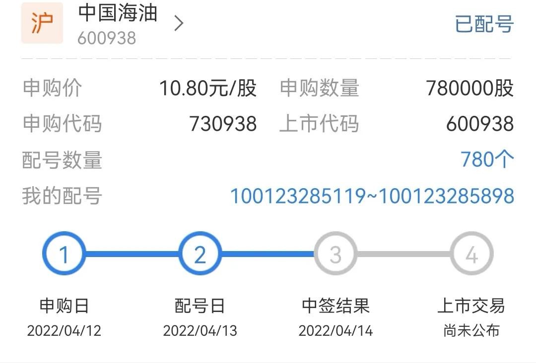 今天发布了中签结果,中签率0.427%,顶格申购保底中一签!有网友中了3签,需要缴纳32400元!最近新股破发严重,更有经纬恒润4个亿的资金弃购!中国海油这么大的盘子,280亿涨了也是蚊子肉,跌了可能就是满仓中石油!