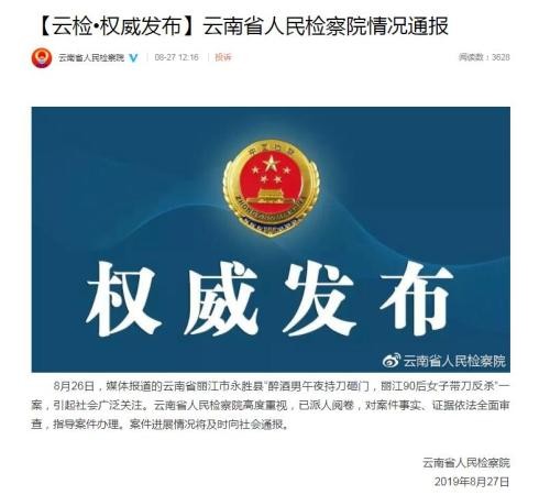 中新网8月27日电据云南省人民检察院官方微博消息,8月26日,媒体报道的云南省丽江市永胜县“醉酒男午夜持刀砸门,丽江90后女子带刀反杀”一案,引起社会广泛关注。云南省人民检察院高度重视,已派人阅卷,对案件事实、证据依法全面审查,指导案件办理。案件进展情况将及时向社会通报。