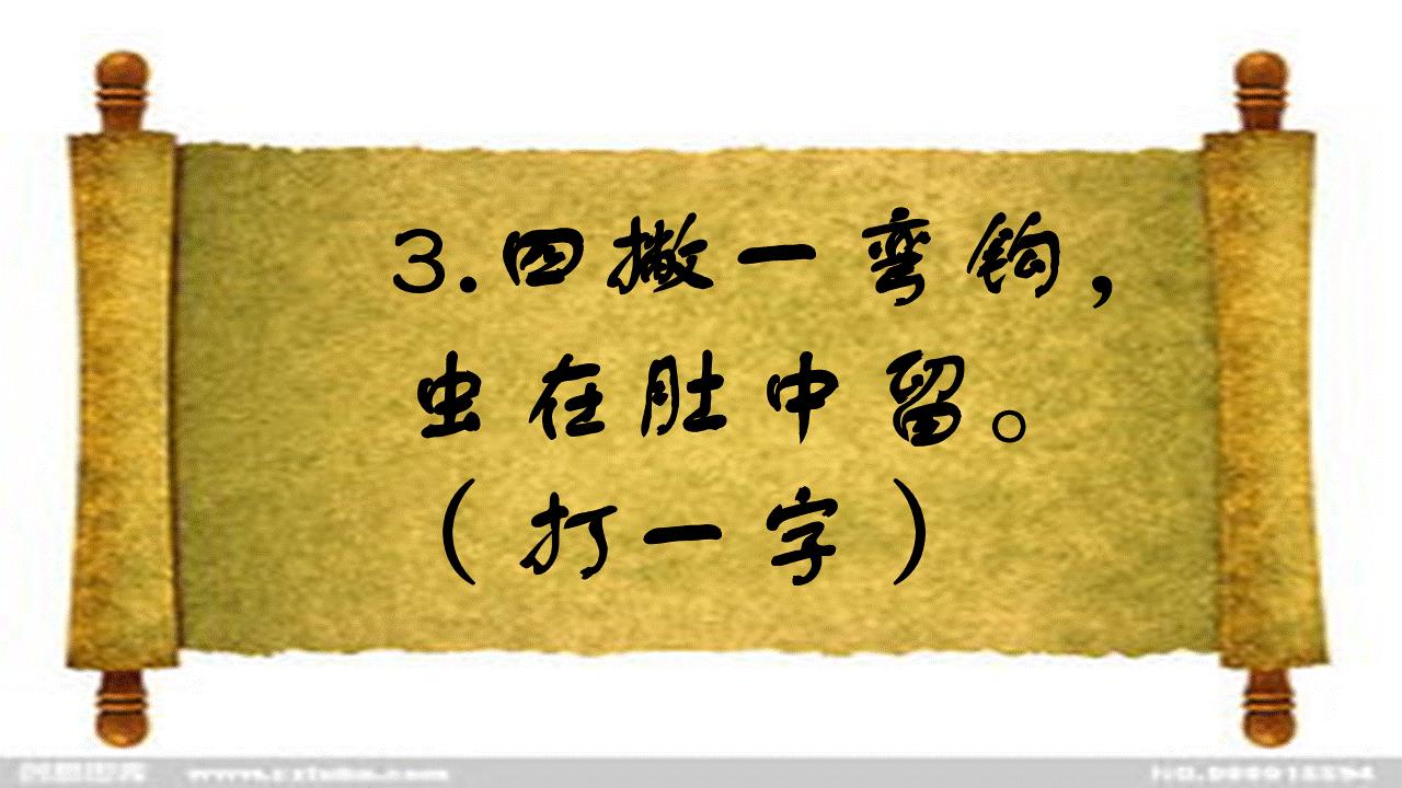 3、四撇一弯钩,虫在肚中留。(打一字)