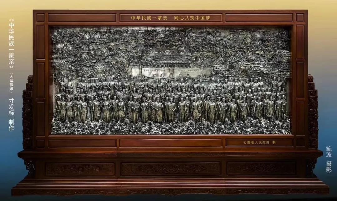 在北京国家民族文化宫里面,有一件名为《中华民族一家亲•同心共筑中国梦》的大型银雕屏风安静地陈列着。这件屏风作为展现中国民族团结进步工作成就的代表作,先后参加过“砥砺奋进的五年•大型成就展”和“伟大历程•辉煌成就”,再现了在中国代表性的壮美山川和人文景观背景下,五十六个民族的中华儿女欢聚天安门前的场景,传递着中华民族休戚与共,携手共进的团结风貌。这件备受赞誉的作品,是国家级非物质文化遗产项目(鹤庆银器锻造技艺)代表性传承人寸发标的代表作之一。