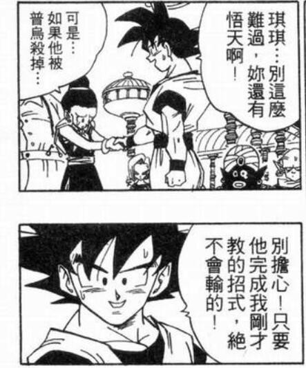 后来特天打18号的时候,悟空根本就不在场,没看见战况。在此时悟空的认知里,特兰克斯和悟天的实力仅仅只有比武大会上发挥的不完全的实力,就能判断融合能够超越布欧。说明了对两个小家伙的实力的自信。悟空不知特兰克斯和悟天实力究竟有多少的情况下就大言不惭的跟布欧说等两天就有人给你带来乐趣。