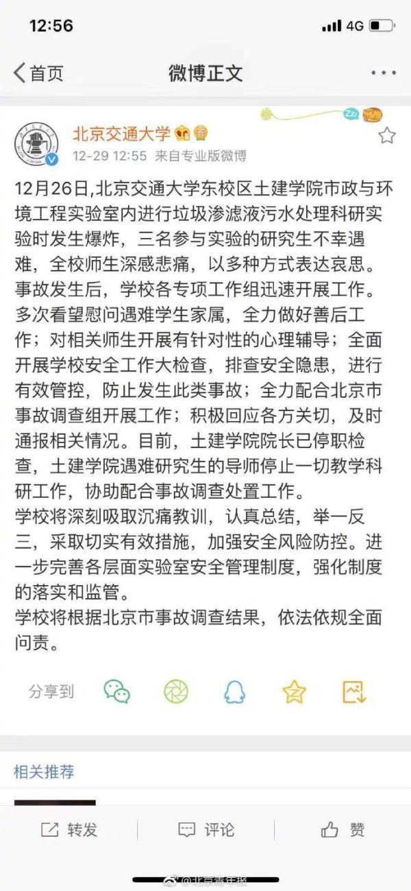 【北交大爆炸事件后续:遇难研究生的导师停止一切教学科研工作】据北京交通大学微博通报,26日,北京交通大学东校区土建学院市政与环境工程实验室内进行垃圾渗滤液污水处理科研实验时发生爆炸,三名参与实验的研究生不幸遇难,全校师生深感悲痛,以多种方式表达哀思。目前,土建学院院长已停职检查,土建学院遇难研究生的导师停止一切教学科研工作,协助配合事故调查处置工作。学校将根据北京市事故调查结果,依法依规全面问责。