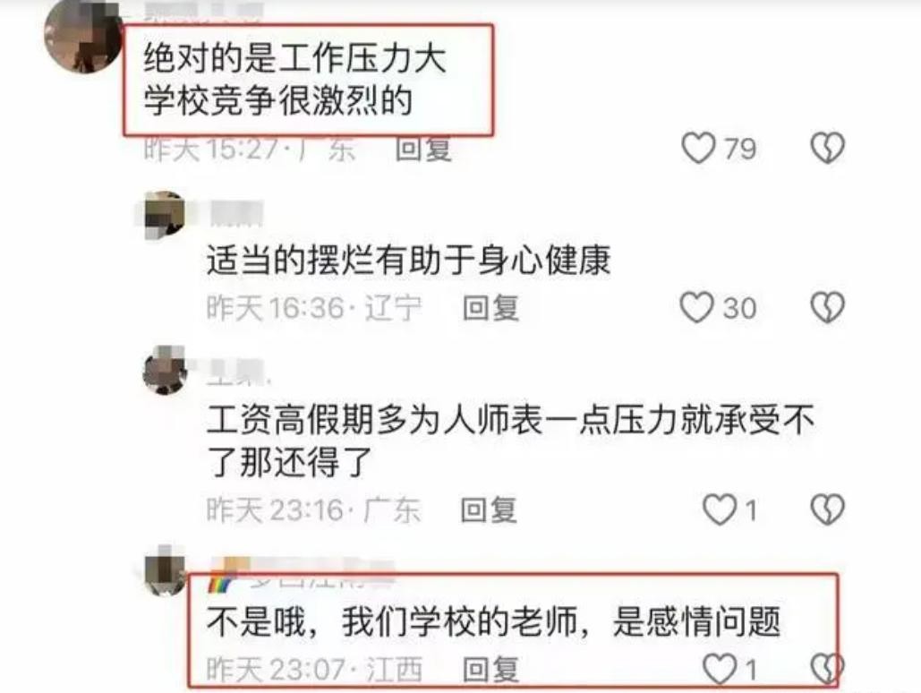 因此大众纷纷猜测这名女教师自杀的原因。有人猜测会不会是因为工作压力太大的原因,毕竟教师虽然是一份体面且稳定的工作,但所承受的压力也是不小的,会不会是因为压力太大,导致一时间想不开最终选择结束了自己的生命,毕竟之前也有不少这样的例子。
