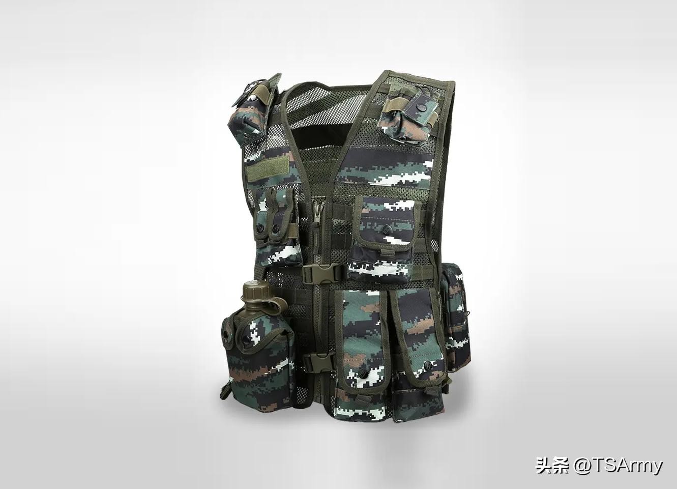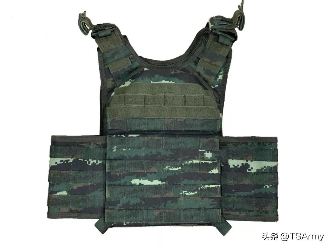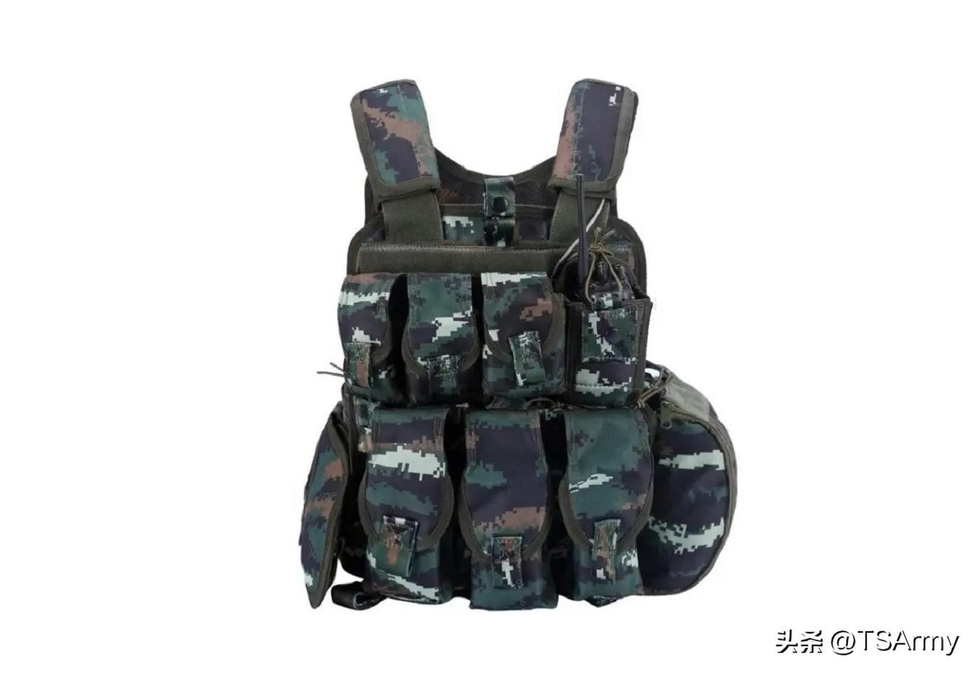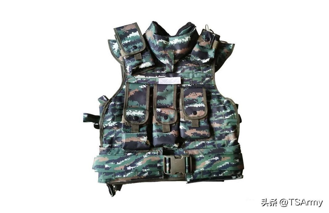 使用虎斑数码迷彩的还有13式特战背心,大约在10年前左右装备武警特战部队,这种防弹衣具备很强的模块化能力,正面、侧面和背面都带有接口和魔术贴,可根据不同的使用情况,在上面加装各种拓展,比如步枪弹匣包、手榴弹包、杂物包、对讲机包等等,总之功能很强大,也深受武警特战人员的喜爱。