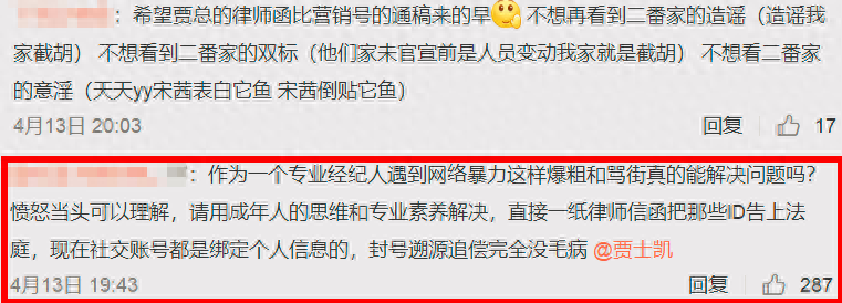 但对于经纪人遇到网络暴力直接爆粗口的反应,也有粉丝觉得不妥:“愤怒当头可以理解,请用成年人的思维和专业素养解决”……