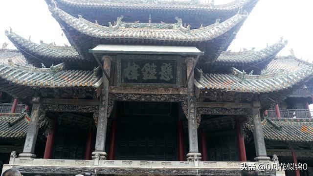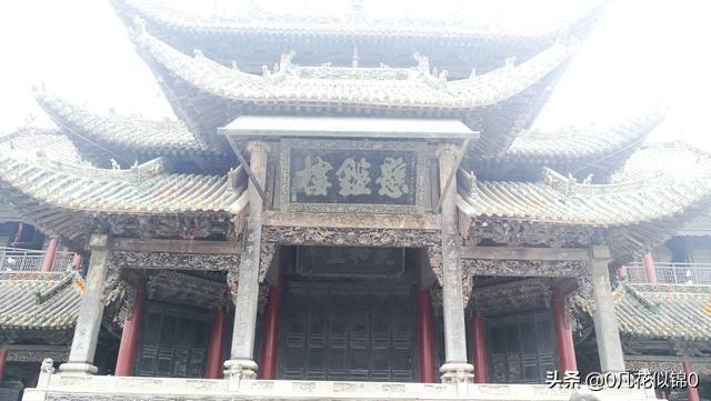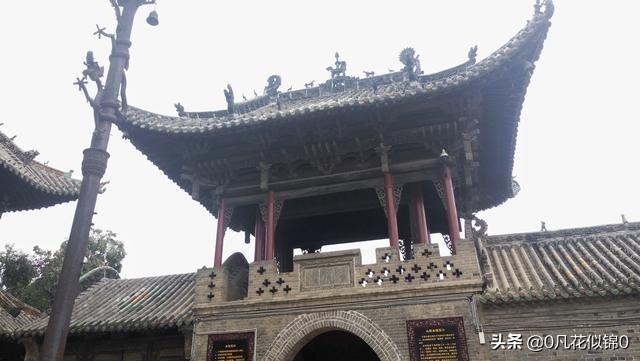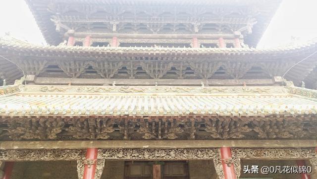 悬鉴楼,又名八卦楼、戏楼,三重檐歇山式建筑。飞檐斗拱,层层叠立。戏楼两边为敞开式钟楼、鼓楼。