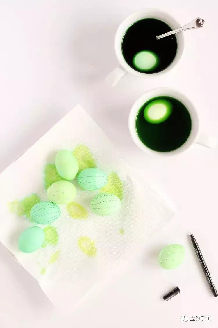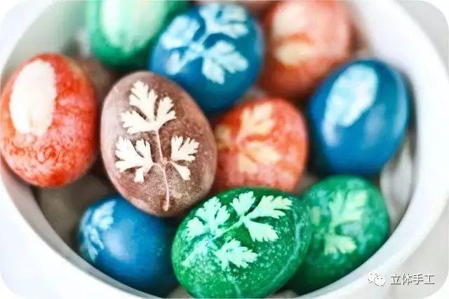 把鸡蛋打开一个小孔,取出蛋清和蛋黄,然后把蛋壳放入染料水中染色,染好颜色后取出,晾干,画上绿植图案。