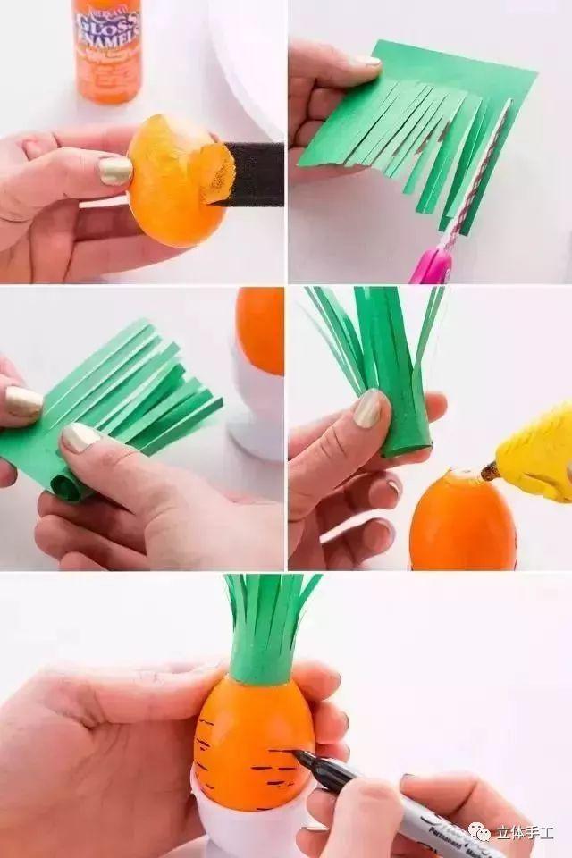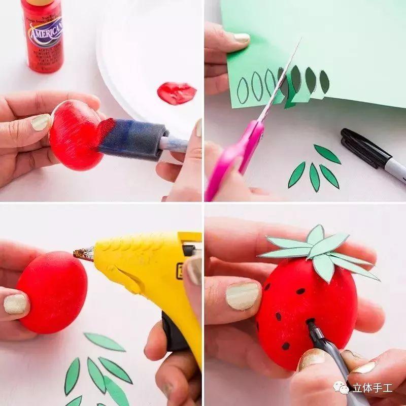 在鸡蛋上涂上水果的颜色,在卡纸上剪下叶子的形状,粘在水果顶端,在水果上画上图案即可。