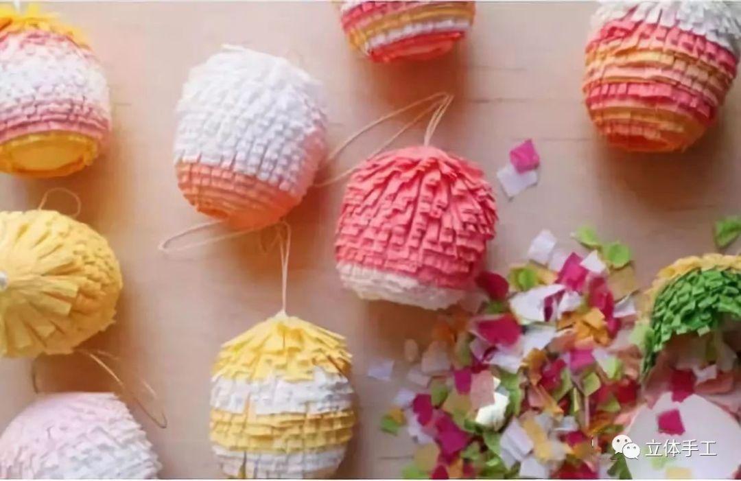 把褶皱纸剪成流苏状,然后一层一层贴满鸡蛋壳,在鸡蛋壳的顶端粘贴上一根线提着就OK了!
